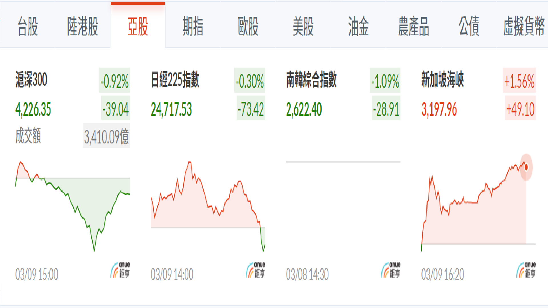 今天亞股表現情況,滬深300下跌39點,跌幅0.92%,指數來到4226點,日經指數下跌73點,跌幅0.3%,指數來到24717點,韓國綜合休市一天,新加坡上漲49點,漲幅1.56%,亞股比較晚收盤,走勢會更貼近晚上要開盤的歐美股市,當小道瓊上漲,亞股就會收到相對好,昨天台股跌的比亞股都重,今天單純就是把昨天多跌的漲回來。