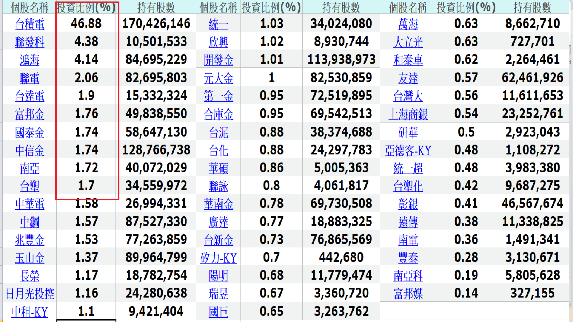 首先我們先看一下元大台灣五十成份股的持股明細,持股前十名分別是,第一名的台積電,持有46.88%,持有第二名的聯發科,持有4.38%,持有第三名的鴻海,持有4.14%,持有第四名的聯電,持有2.06%,持有第五名的台達電,持有1.9%,持有第六名的富邦金,持有1.76%,持有第七名的國泰金,持有1.74%,持有第八名的中信金,持有1.74%,持有第九名的南亞,持有1.72%,持有第十名的台塑,持有1.7%,元大台灣五十持有前十名的股票,就佔總基金的68%了,今天我們就拿前十檔來判斷我的方法是否可行,中長線投資三要素,基本面,產業面及自我心理面,持有一檔有價值的公司需符合,獲利穩定性,獲利有續航力,穩定配息,股價不能距離淨值太遠,具競爭力(就是產業龍頭),最好未來有規劃十年,二十年的目標,讓競爭對手難以超車。