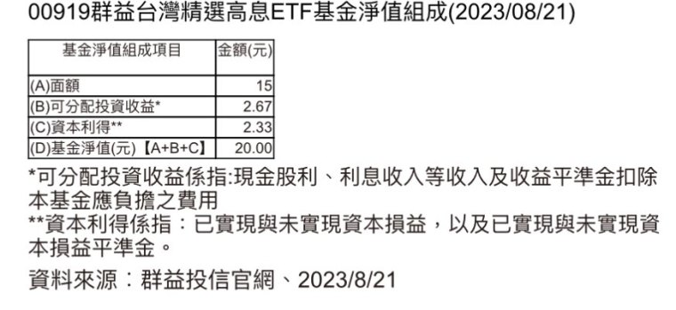 新聞說:國人愛以台股ETF存股,其中以「高股息ETF」更受青睞,規模達5741億元、人數286萬3232人,占總收益人與規模一半以上。其中在6月配出11%年化配息率的群益台灣精選高息(00919)最受矚目,接下來9月是否能維持10%以上的年化配息率,市場已開始討論也深感期待。從群益官網淨值組成數據以及經理人對00919配息政策的表態,可以發現00919完美結合了「精選真高息」的選股邏輯,以及「未來四季穩定配息」的配息策略,也就是說,以00919現有可分配股利為2.67元來推估,未來至少四季配息不會低於首次配息金額0.54元,強勢回應投資人對台股高息ETF能穩定配出高息的殷切期待。對於關心00919在9月是否還能領到高息的投資人來說,可以從其最新基金淨值組成來分析觀察,以8月21日00919的淨值組成為例,其淨值20元之相關占比項目與金額為面額15元、可分配投資收益2.67元、資本利得2.33元。