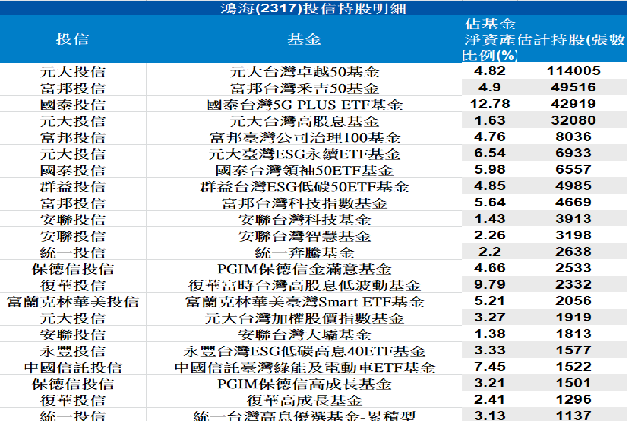 目前持有鴻海超過1000張的有22家基金及ETF,包括元大台灣卓越50持有鴻海114005張,富邦台灣釆吉50持有鴻海49516張,國泰台灣5G PLUS ETF持有鴻海42919張,元大台灣高股息持有鴻海32080張,富邦臺灣公司治理100持有鴻海8036張,元大臺灣ESG永續ETF持有鴻海6933張,國泰台灣領袖50ETF持有鴻海6557張,群益台灣ESG低碳50ETF持有鴻海4985張,富邦台灣科技指數持有鴻海4669張,安聯台灣科技持有鴻海3913張,安聯台灣智慧持有鴻海3198張,統一奔騰持有鴻海2638張,PGIM保德信金滿意持有鴻海2533張,復華富時台灣高股息低波動持有鴻海2332張,富蘭克林華美臺灣Smart ETF持有鴻海2056張,元大台灣加權股價指數持有鴻海1919張,安聯台灣大壩持有鴻海1813張,永豐台灣ESG低碳高息40ETF持有鴻海1577張,中國信託臺灣綠能及電動車ETF持有鴻海1522張,PGIM保德信高成長持有鴻海1501張,復華高成長持有鴻海1296張,統一台灣高息優選持有鴻海1137張,這22張基金及ETF就持有鴻海297135張,目前投信總共持有鴻海30.3萬張,所以只要注意上面這些基金及ETF,就知道投信會不會再賣鴻海。