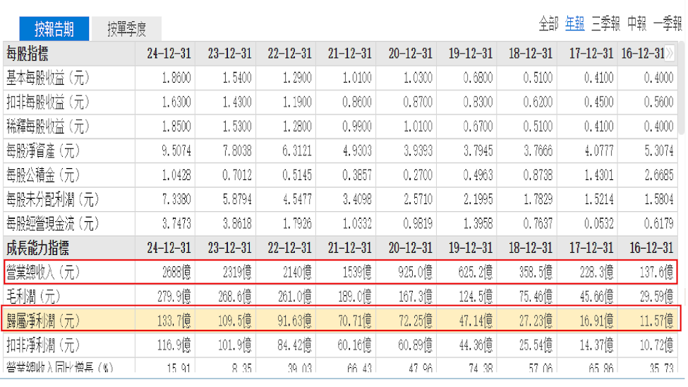 之前很多投資人喜歡用立訊會打敗鴻海,要是立訊的營收從幾千億到一兆,接著兩兆,三兆,五兆,八兆這樣成長,那確實就是要擔心鴻海被立訊打敗,一開始立訊的營收成長確實很唬人,2016年營收137.6億人民幣,2017年營收228.3億,2018年營收358.5億,2019年營收625.2億,2020年營收925億,2021年營收1539億,按照這樣營收成長速度,確實再十年能威脅到鴻海,畢竟都是每年以50%的營收成長在增加,1539億人民幣大概就是七千億台幣了,2022年營收2140億,立訊的營收開始放緩了,不過年增39%也算是很厲害,2023年營收2319億,營收僅年增8.36%,當立訊營收來到2319億人民幣時,等於是1兆台幣了,開始和廣達,緯創營收差不多了,2024年營收2688億,營收年增15.9%,大家很明顯看到立訊營收來到1兆元以上時,年增的速度就開始變慢了,道理也很好懂,想要和鴻海正面對決,你就是要去搶鴻海的訂單,不要說的一付鴻海是豆腐做的或是吃素的,當立訊營收夠大時,就是要和鴻海對決,以結果論來說,事情沒有傻瓜想的這麼簡單,近幾年大家看到立訊的成長放緩,就沒有再說過立訊要打敗鴻海這種蠢話了,尤其鴻海找到了新的成長動能AI伺服器,目前大部份的訂單都來自於美系雲端大廠,川普是不可能讓中國的廠商去吃到美系雲端大廠AI伺服器的訂單的,所以大家會發覺鴻海營收在六兆時,結果今年營收成長的速度也是很驚人,上半年鴻海營收累計成長19.7%,完全是超過立訊的成長速度。